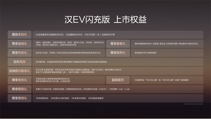 同时,比亚迪还为用户准备了置换无忧礼、1年免费闪充权益、0首付/0利息/0月供任选其一的金融礼、3年3次基础保养、包含3年免费取送车的尊享贵宾礼等共11项权益。针对追求个性的用户,官方推出价值超1.2万元的“汉纳百川”进阶生活套装,限时特惠价仅需3999元。
